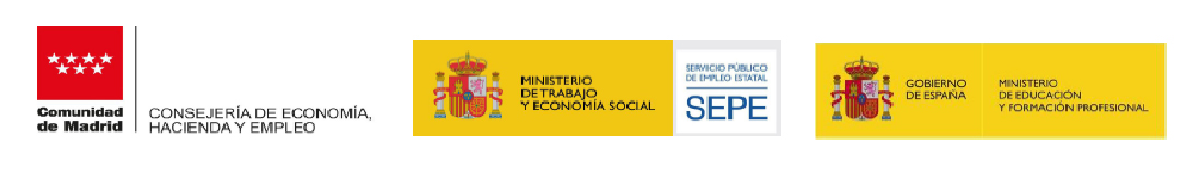 Formación financiada por la Consejería de Economía, Hacienda y Empleo de la Comunidad de Madrid, así como por los Ministerios de Trabajo y Economía Social y de Educación y Formación Profesional.